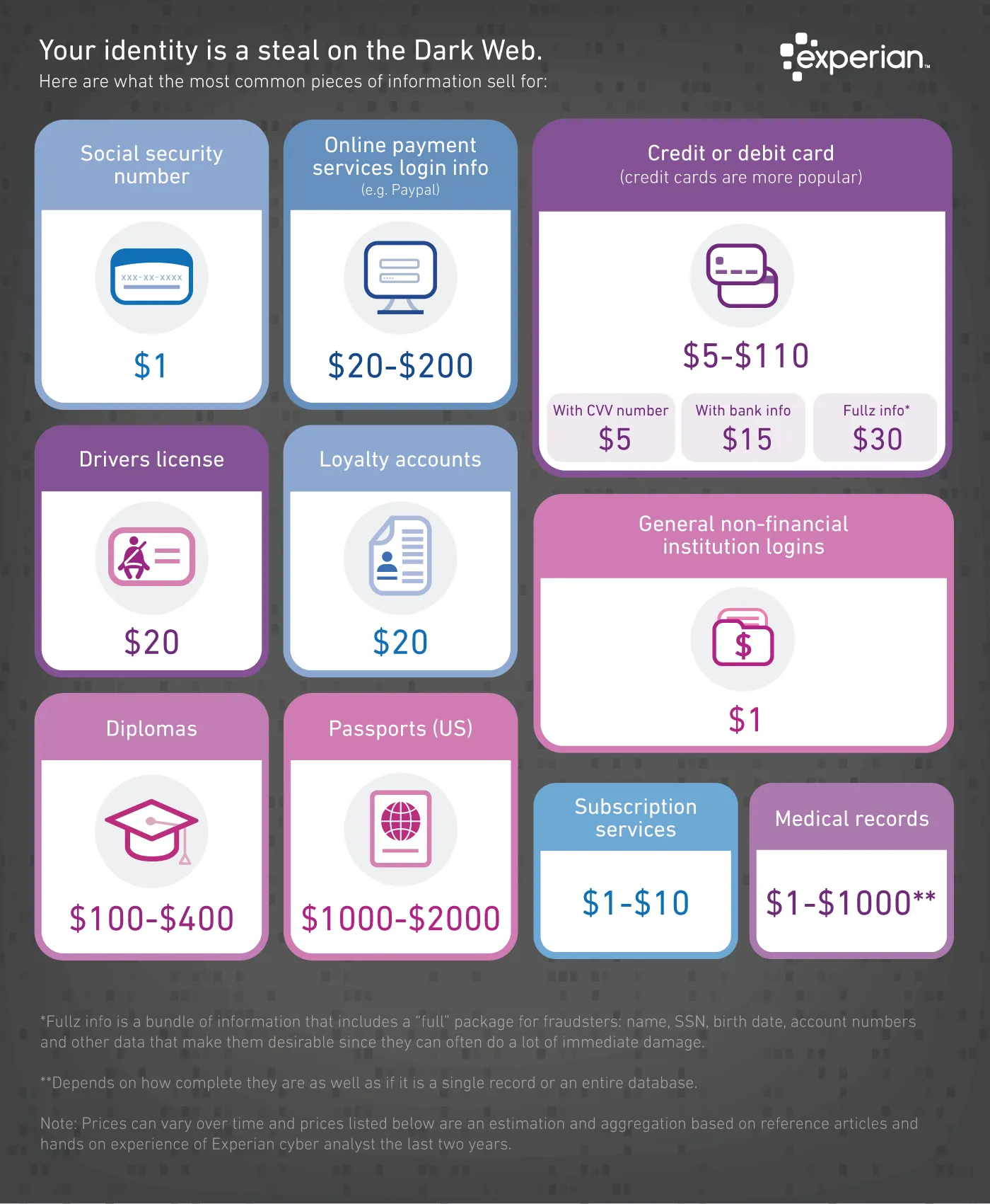 Sources: Liv Rowley on Flashpoint, Richard on Dark Web News, and The Hidden Data Economy by Charles McFarland, François Paget, and Raj Samani. Prices can vary over time and prices listed below are an estimation and aggregation based on reference articles and hands-on experience of Experian cyber analyst the last two years.